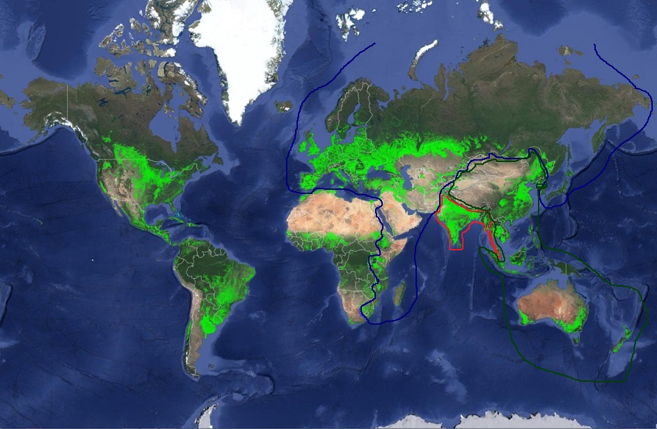 Superimposing the two I was startled by the differing distributions and what it implies. Most agricultural lands are existing in two narrow bands that cross the globe in both north and south temperate regions. When you consider population distributions you see that two of the largest agricultural regions exist in the least dense regions, the Americas and Europe. In the densest, only India has enough farmland to supply its population. But it may not be enough as its population increases.