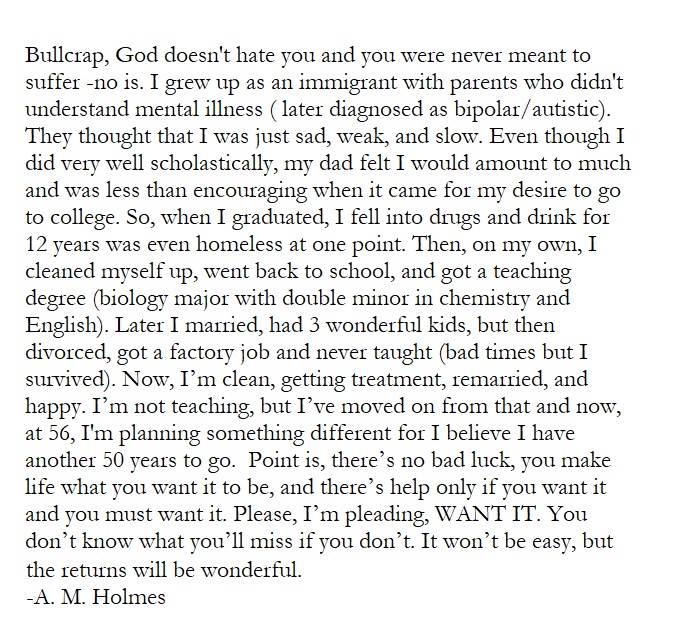 Someone on Twitter posted that “God hated” them and that she was “meant to suffer”. My reply ended up to be too long for a regular post so I “jpeged” it. Here it is, what do you think?